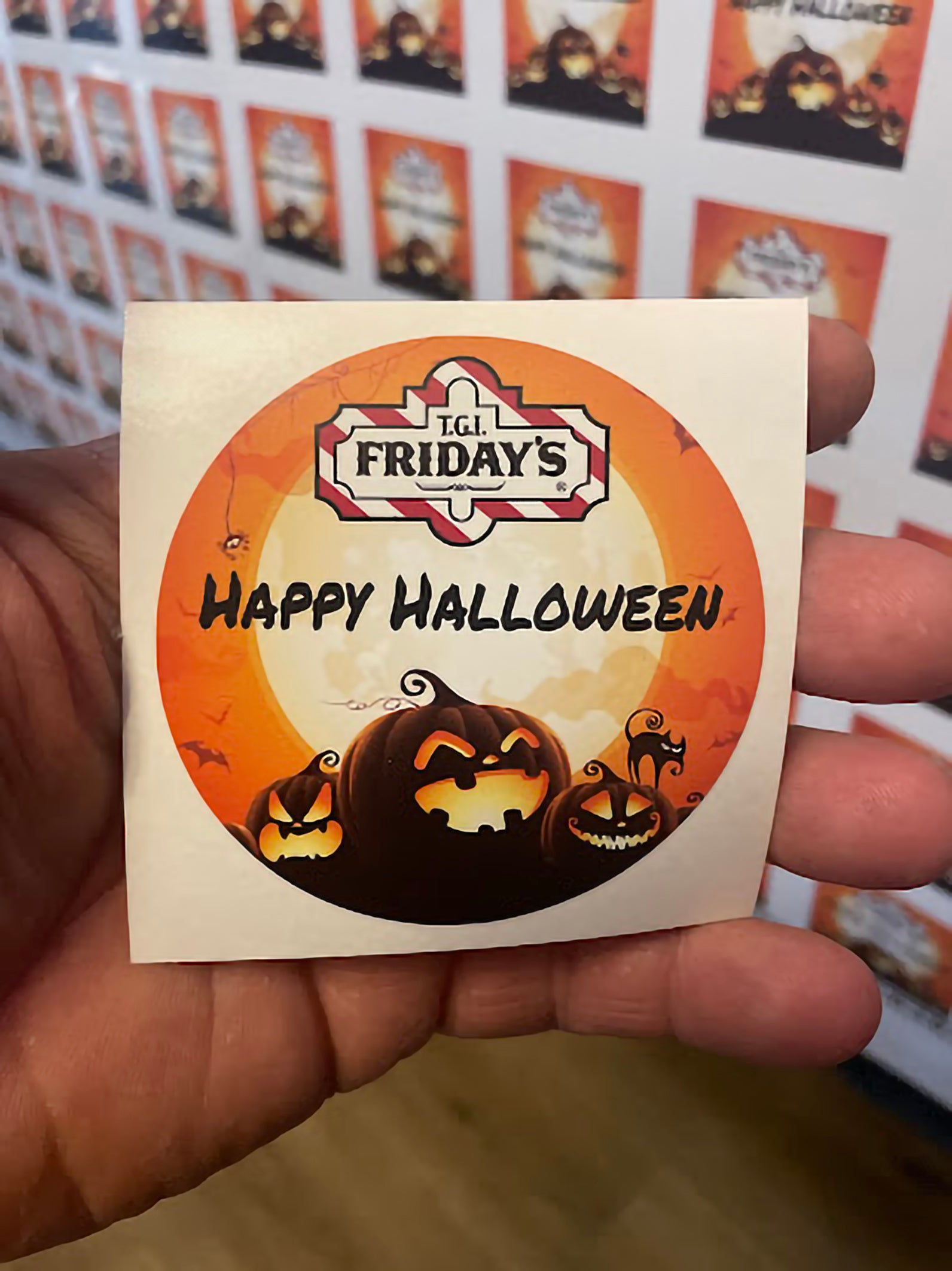 Here are some stickers we printed for T.G.I. Fridays for a Halloween event