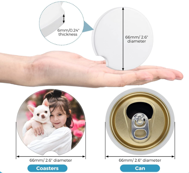 Ceramic Coasters: This ceramic cup holder measures approximately 66 x 6 mm/ 2.6 x 0.24 inches and is designed to fit most cup holders. The high-quality absorbent ceramic stone easily soaks up any water from the cup, keeping your car clean. Personalize the coaster with your own design using thermal transfer, making it the perfect individualized gift for friends, family, or as a company gift.
